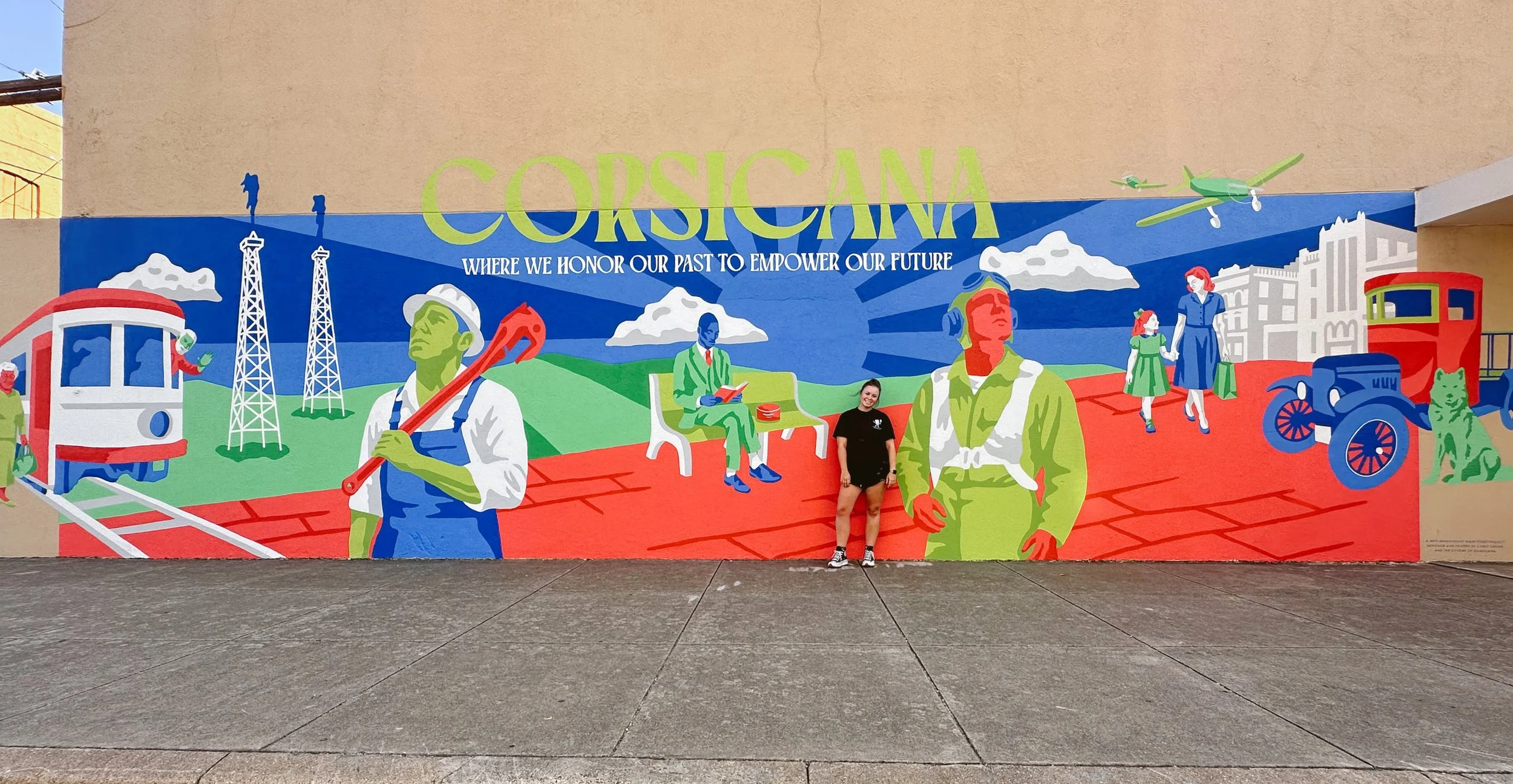The Corsicana Main Street program wanted to commemorate their 40th Anniversary with a community led mural. A questionnaire was sent out to residents asking them what they wanted to see included in the mural. Some of the repeat subjects were the trolley car, the discovery of oil, the WW2 cadets that trained in the 40s, iconic downtown buildings, Wolf Brand Chili, Collin Street Bakery, as well as a couple of specific people who have been a part of Corsicana’s history. I then took their suggestions, created art, and then we hosted a community paint day. Everyone was invited to come out and be part of painting the mural.